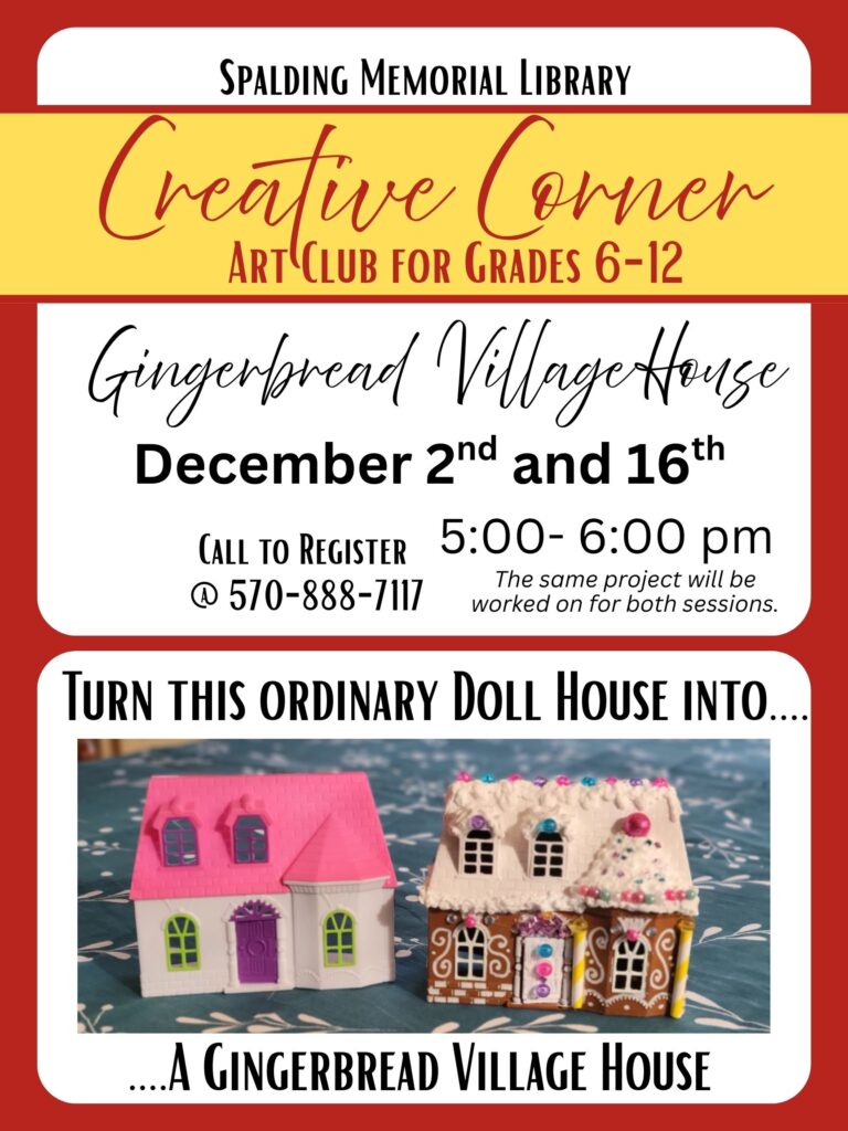 Join Laura for Art Club! Grades 6-12 Welcome! The two classes in December will be centered around creating your own house for a Gingerbread Village. You can attend once and complete your house or attend twice and add more elaborate decorations! December 2nd and 16th from 5-6PM. Call the Library for more information and to register for the Club, 570-888-7117!