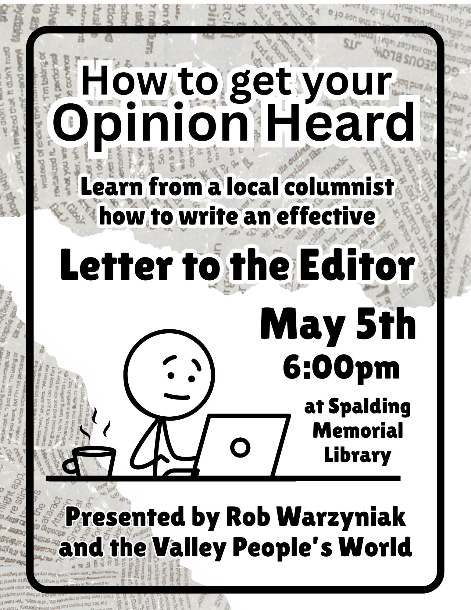 Do you want your opinion to be heard in the community? Come to this presentation by Rob Warzyniak and the Valley People’s World to learn some tips and tricks on how to write a letter to the editor. Rob Warzyniak is a local columnist.