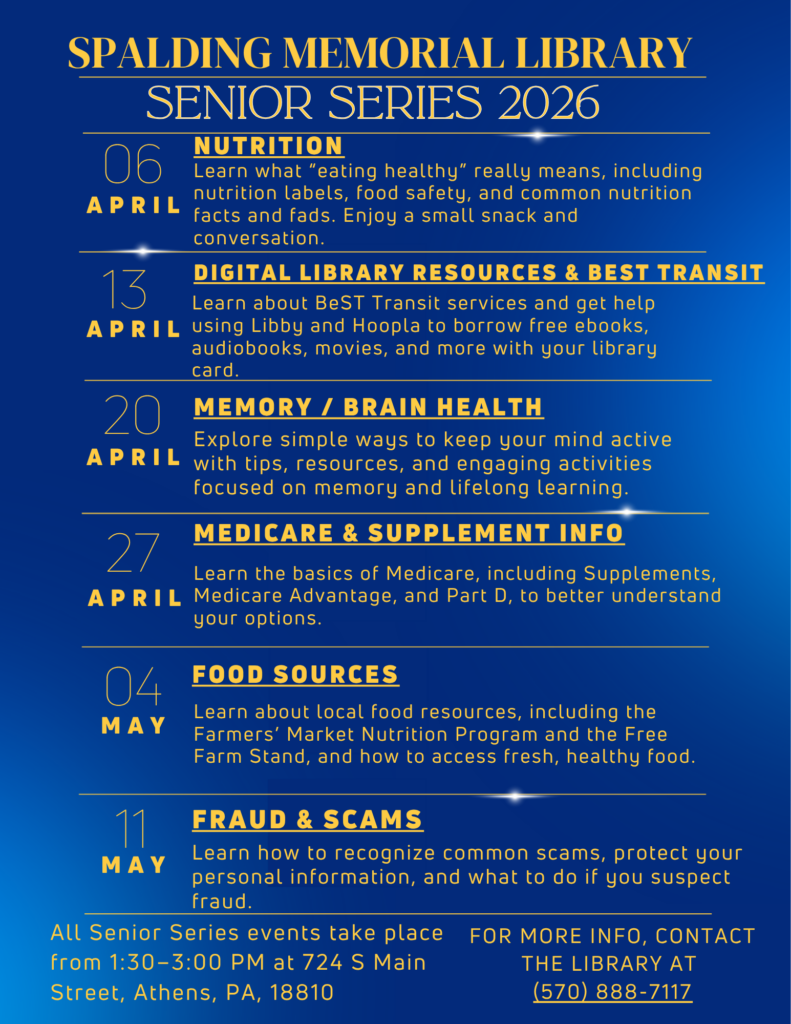 The Senior Series at Spalding Memorial Library offers engaging programs designed to help older adults stay informed, connected, and active in the community. Topics include health, nutrition, local resources, technology, and more. Each session features guest presenters and opportunities to learn, ask questions, and connect with neighbors.
